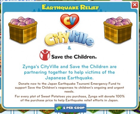 If you don’t have money in your pocket, you can still donate to Japan Earthquake Relief while playing Cityville, Zynga will donate 100% of the purchase price to help Earthquake relief efforts in Japan.