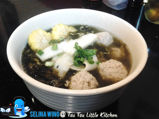 Seaweed Hakka Noodle Soup served with sweet corn, pork balls and fish cake. So, this is high recommended!